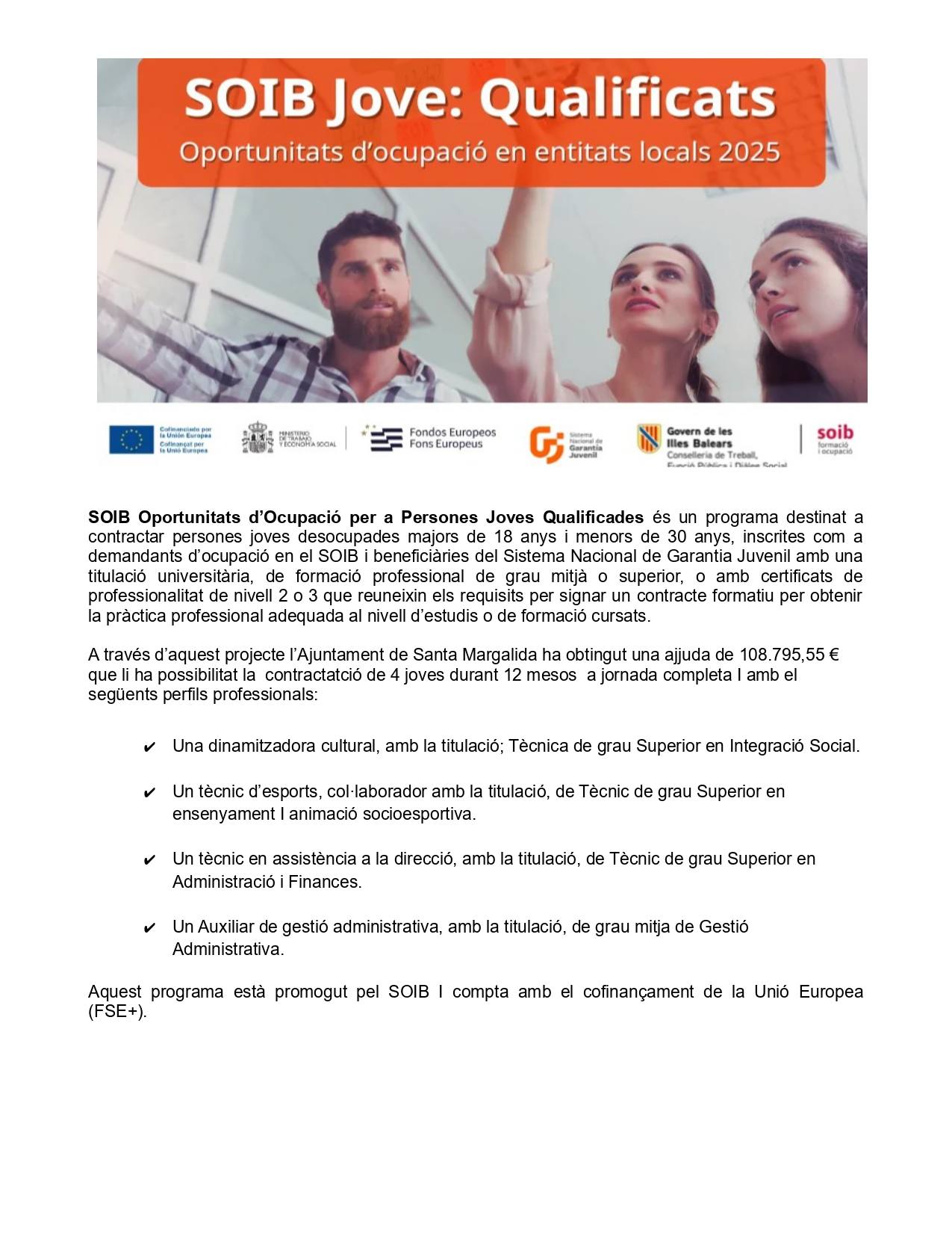 ℹ️ El programa ha contractat un total de 4 joves dins l’itinerari d’Ocupació per a Persones Joves Qualificades en Entitats Locals 2025. Està promogut pel SOIB i compta amb el cofinançament de la Unió Europea, té una durada de 12 mesos i una inversió total de 108.795,55 €